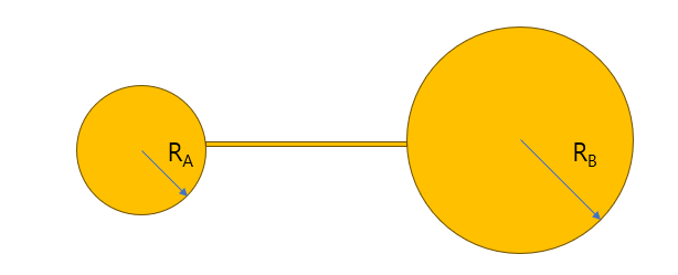 두개의 A, B Sphere conductor가 충분히 길고 얇은 wire conductor로 다음과 같이 연결되어 있다고 해보자.