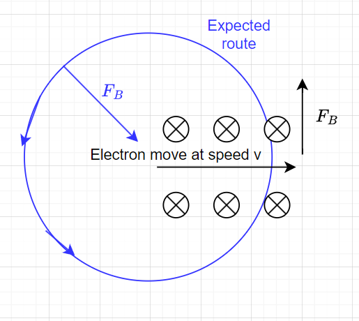 v와 B는 perpencidular하므로, $ F_B = q(v \times B)$에 의해 q는 힘을 받는다. $F_B$가 평면의 모든 공간에서 동일한 크기로 작용한다면, +q가 원운동하게 될 것이다