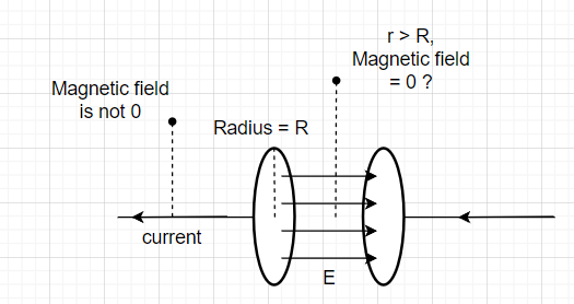 capacitor를 통해 전류가 흐를 때, ampere's rule을 적용해보았을 때 capacitor의 radius = R 이라고 놓았을 때, r>R 인 위치에서 closed loop를 penetrate하는 current가 0이고, 따라서 해당위치에서 magnetic field값은 0이다.
