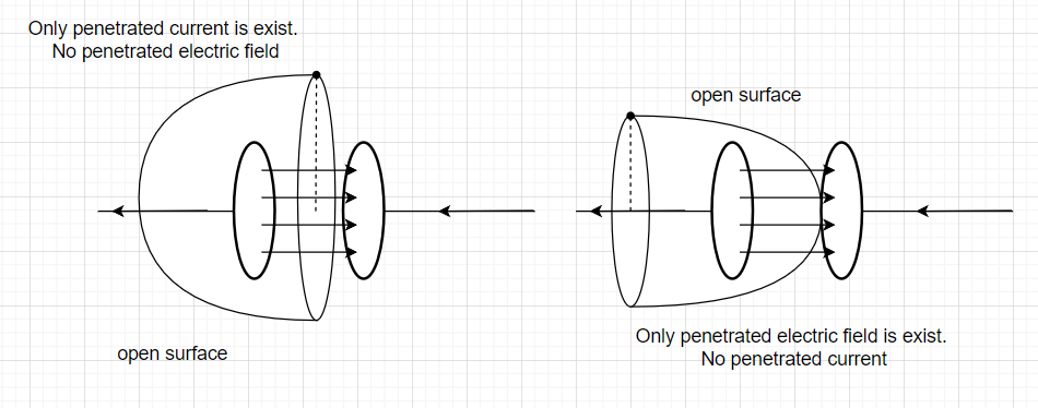 최종적으로 수정된 ampere's law는 선택된 closed loop를 기준으로 연장한 open surface를 penetrate하는 electric field변화 & current를 통해 계산된 값이다.