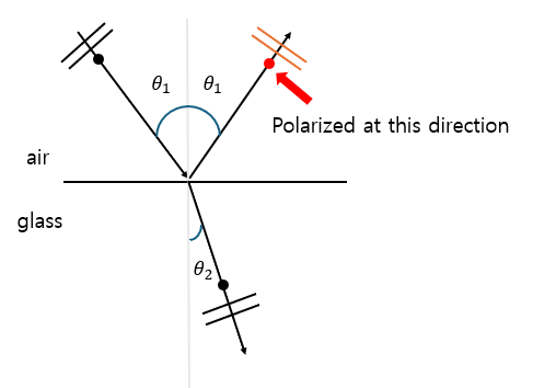water이나 glass와 같은 conductor가 아닌 dielectric media에 unpolarized light를 보낼 경우, light는 bruwster angle에서 경계면에 perpendicular한 polarized light로 반사된다. 방향은 아래 그림과 같이 경계면에 perpendicular한 방향이고, 경계면에 parallel한 방향의 성분은 제거된다.