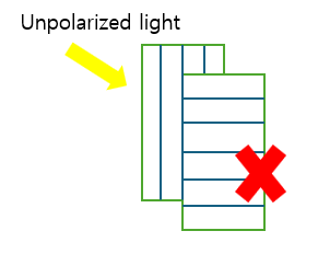$E_0 cos\theta $ 이다. 그런데, 에너지는 E의 제곱에 비례하므로, $ E_0 cos^2\theta $ 가 된다. 평균적인 Electric field 방향이 균형적인 경우, 전체 light의 강도(Intensity)를 $ I_0 $ 라고 하였을 때, 빨간색방향으로 집중시킨 light의 강도는 $ \frac{1}{2}I_0 $ 가 된다. 이론적으로는 그렇지만, 실제로는 20~30% 정도가 된다.