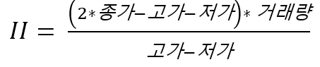 여기에 거래량을 곱함으로써, II는 거래량이 크고 종가가 하루중 상대적으로 높은 위치에 있을수록 더 큰 값을 나타내는 지표가 됩니다.