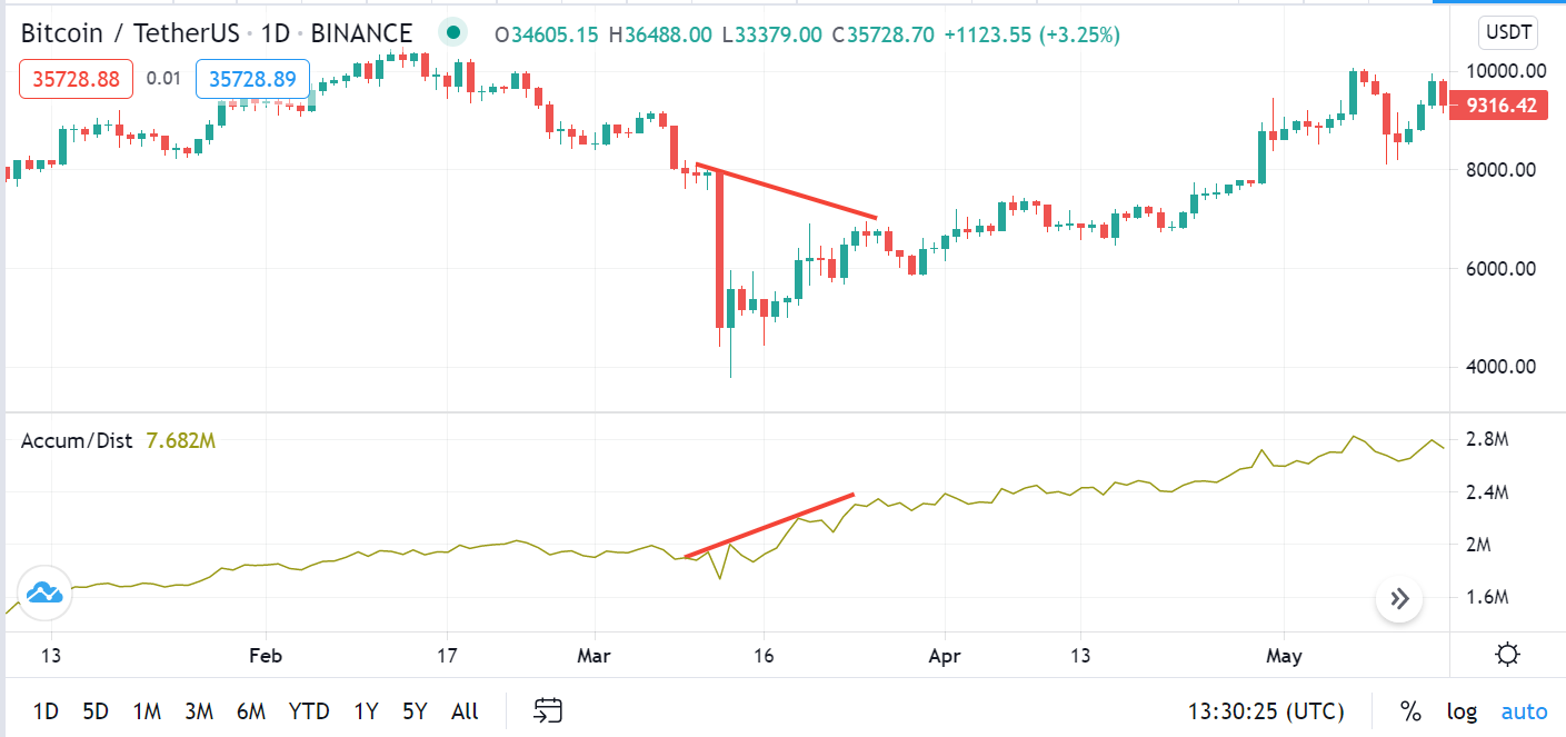 위 차트는 비트코인의 차트입니다. 일반적으로, A/D는 가격을 따라서 형성됩니다. 하지만 그림에서 가격이 더 낮아졌음에도 불구하고 A/D값이 상승한 것을 볼 수 있습니다.