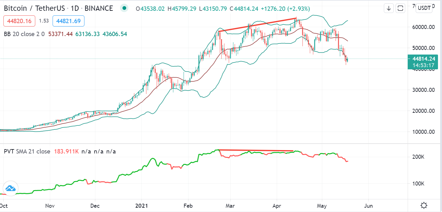 아래는 비트코인의 예시입니다. 빨간색 선이 다이버전스가 나타난 부분이며, 이후 하락한것을 확인하였습니다.