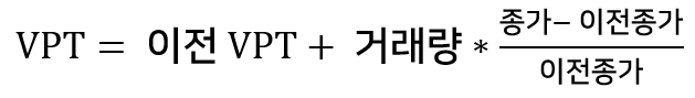 OBV가 단순히 거래량만을 더했다면, VPT는 (거래량*종가의 변화율)이 누적되어 더해집니다.