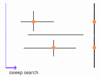 수직 직선을 만날 때, y좌표의 범위를 1d range search함으로서, 교차하는지 여부를 찾는다. 수평직선의 오른쪽 끝에 도달할 때마다 BST에서 y좌표를 삭제한다.