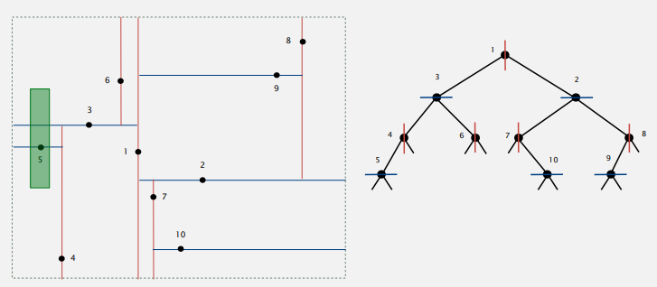 그림을 보면 각각의 node는 일반 BST의 node와는 다르게 방향정보를 가지고 있다. 수직방향 node의 left/right subtree의 node들은 항상 해당 line보다 왼쪽/오른쪽에 있다. 수평방향 node의 left/right subtree의 node들은 항상 해당 line보다 아래/위에 있다. 이런 규칙을 갖는 BST tree에 node를 삽입하고, 찾을 때는 이러한 정보를 활용해서 탐색할 필요가 없는 subtree 를 배제하는 방식으로 recursive하게 탐색한다. 평균적인 성능은 R + logN 이고, worst case에서 R + √N 이다.