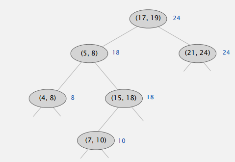 한가지 특징은 BST의 각 node들은 subtree에서 존재하는 max right end point값을 갖고 있고, insert/delete시마다 이 값은 tree를 거슬러 올라가며 recursive하게 update된다.