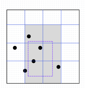 각각의 배열의 요소는 각 squre 내부 point의 list이다. 해당 범위로 표현된 직사각형을 포함하는 grid squre만을 조사함으로서, 손쉽게 값을 얻을 수 있다.