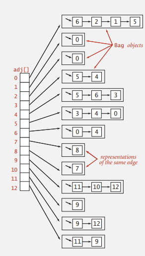 Graph의 표현은 sparse matrix의 표현과 같이 Adjacency-lists representation을 사용한다. 2차원 배열이 아닌 각 vertex의 번호를 배열의 Index로 하여 vertex개수의 크기를 가진 배열을 생성하고, 각각의 vertex에 인접한 vertex들을 가진 Bag을 linked list로 연결하여 표현한다. Bag로 표현하는 이유는 인접한 vertex들간에 순서가 존재하지 않기 때문이다. 실세계에서 모든 그래프의 vertex가 서로 연결되는 밀도높은 경우는 거의 존재하지 않기 때문에, 이 방법은 매우 유용하다.