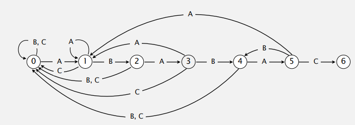 따라서, 상태를 A(4)로 보내서 이미 ABAB는 패턴 매칭이 확정임을 비교없이 결정지을 수 있고 다음단계를 진행할 수 있다.