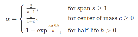 따라서, 가장 오래된 데이터부터 시작해서 재귀적(recursive)하게 가장 최근의 데이터까지 지수가중이동평균을 구할 수 있습니다. 새로운 데이터가 추가되어도 재귀적으로 바로 구할 수 있습니다.