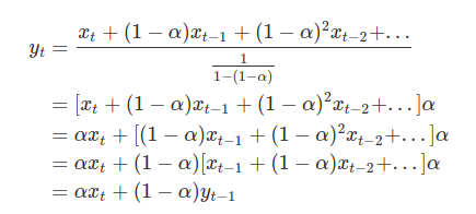 따라서, 현재의 지수가중이동평균은 바로 이전의 데이터의 지수가중이동평균을 이용하여 구할 수 있음을 보여줍니다.